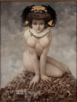 En art au XXème siècle, on peut prendre l’exemple d’Elle, une femme, hypersexualisée, à la poitrine colossale, suggérant une posture séductrice et dominatrice, en étant couchée sur un amas de corps d’homme sanglants. Conformément à l’esprit de la fin du siècle, la femme chez Mossa est perçue comme une femme fatale, dominatrice et cruelle, la courtisane est violente, détruit des hommes. De plus, le péril vénérien, et la peur de la syphilis hante l’époque.