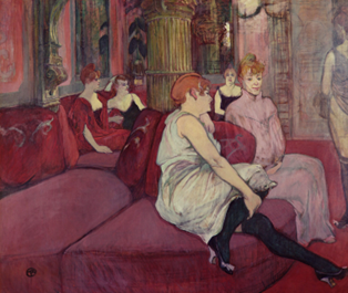 Henri de Toulouse-Lautrec dépeint les bordels qu’il fréquente assidûment, notamment le Moulin Rouge cabaret parisien ouvert en 1889, exprimant la solitude des prostituées blafardes sous la fluorescence des becs de gaz, notamment dans La Goulue arrivant au Moulin Rouge.